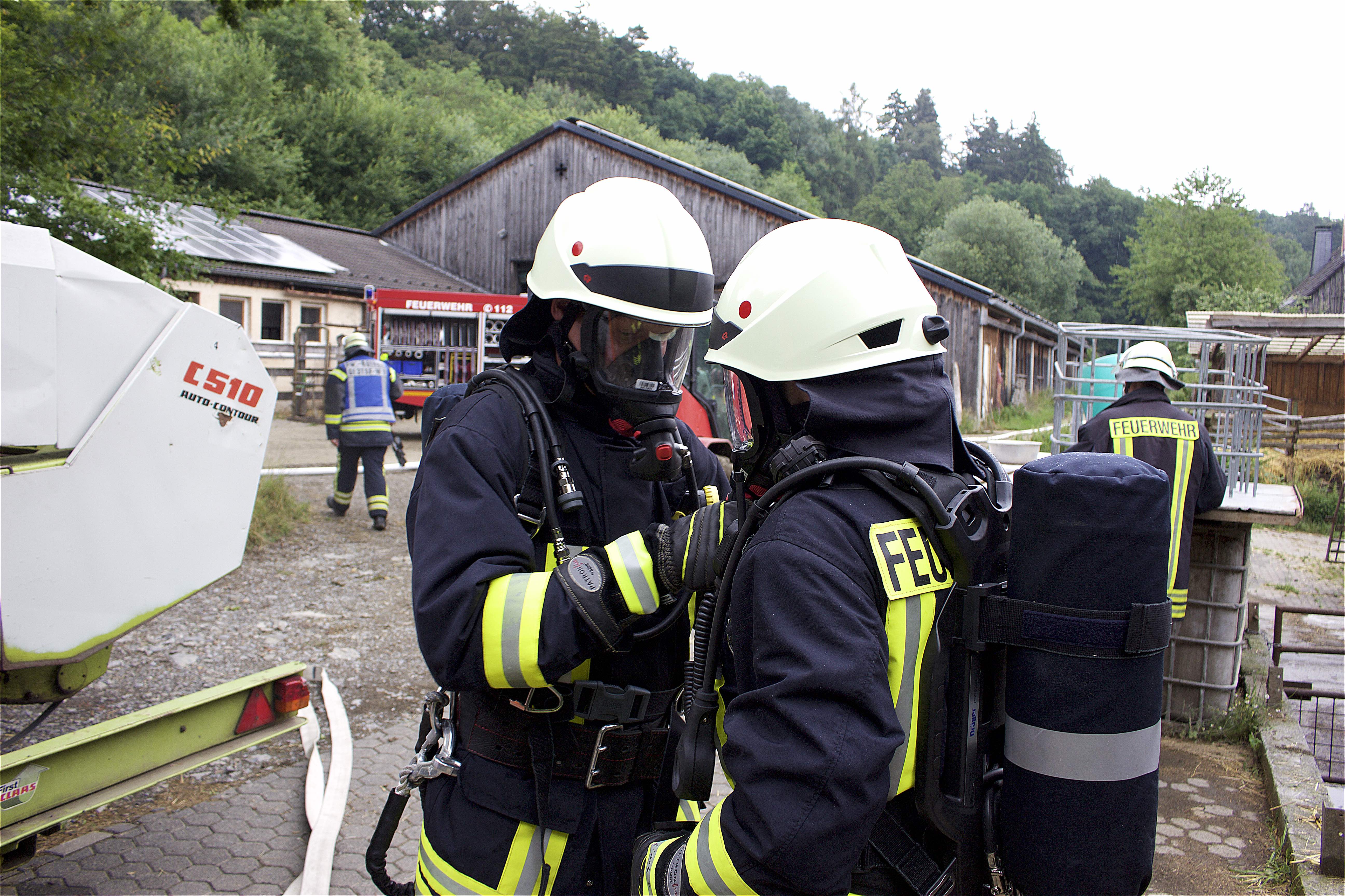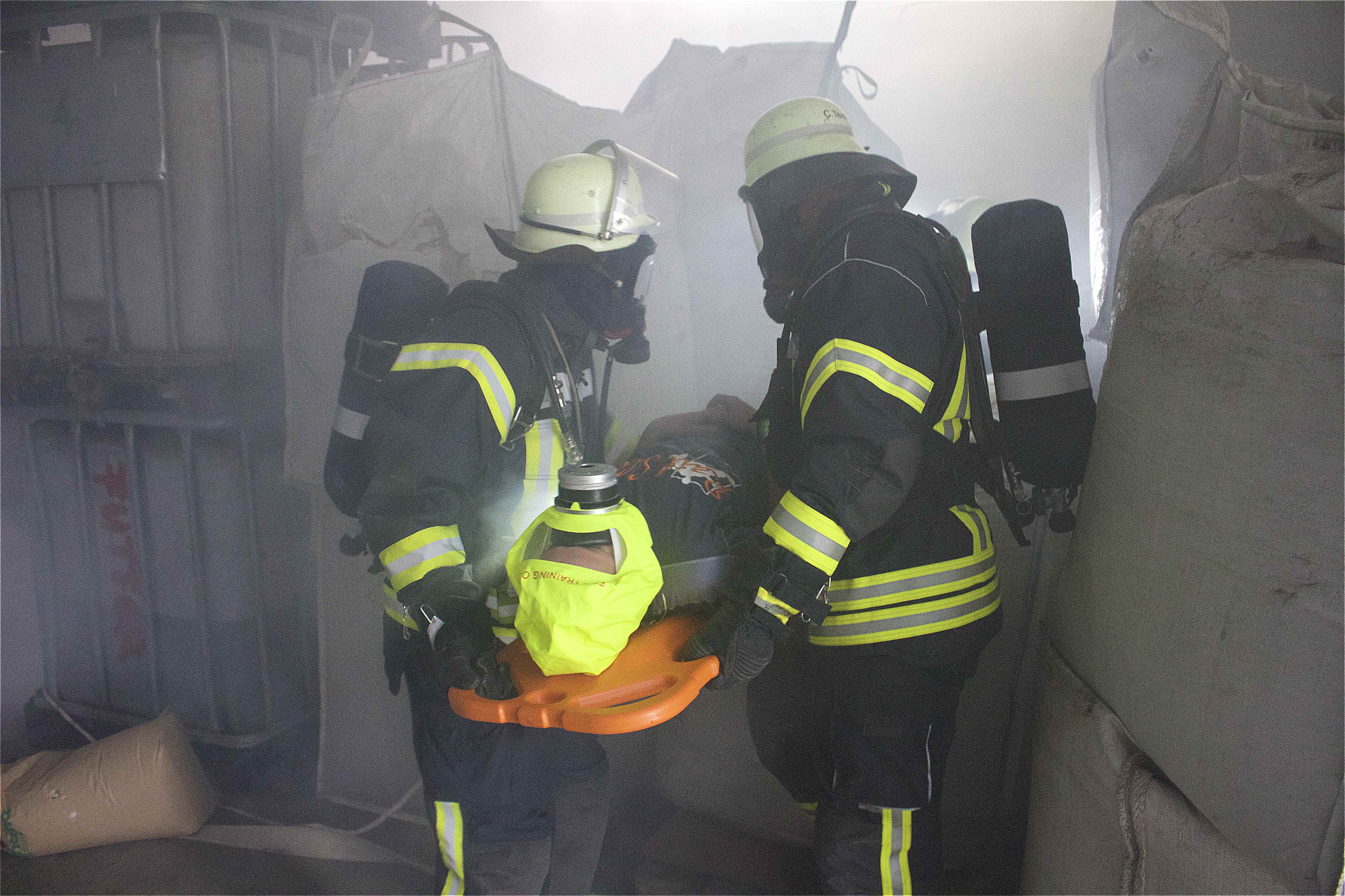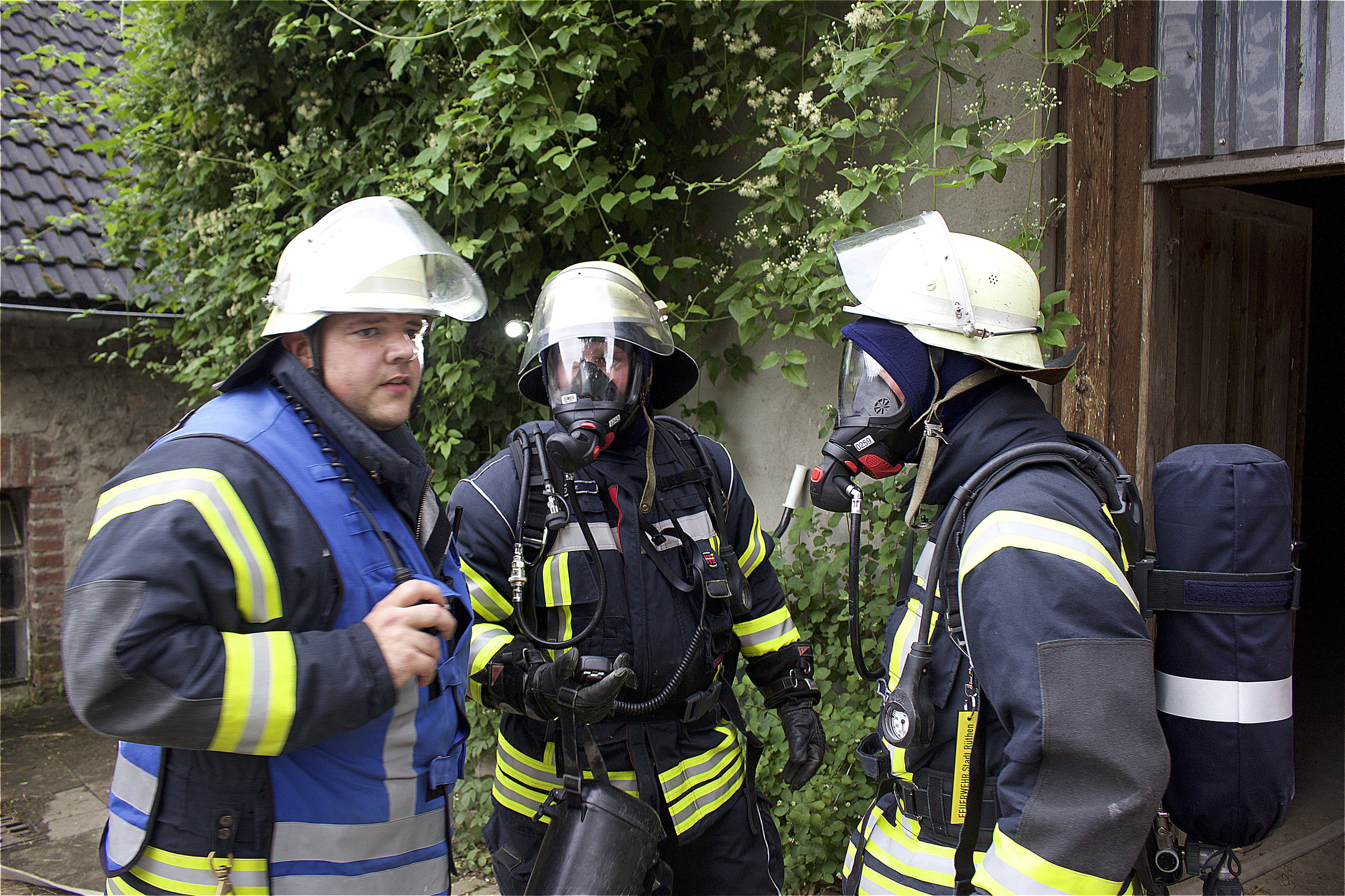 durchsuchten daraufhin Angriffstrupps das Gebäude, während der Rauch bereits aus dem Dach quirlte. Gleichzeitig wurden die Atemschutztrupps aus Kallenhardt von den Kameraden aus Suttrop bei der Menschenrettung unterstützt. Nach nur wenigen Minuten konnten die vermissten Kinder aus dem komplett verrauchten Kornlager gerettet werden. Die Löschgruppe Suttrop, die mit 3 Fahrzeugen vor Ort war, stellte eine Löschwasserversorgung zum Kornlager her. Mit einer Riegelstellung zum Wohngebäude wurde dieses vor einem Übergreifen der Flammen geschützt. Alle Beteiligten zeigten sich nach der Übung sehr zufrieden.