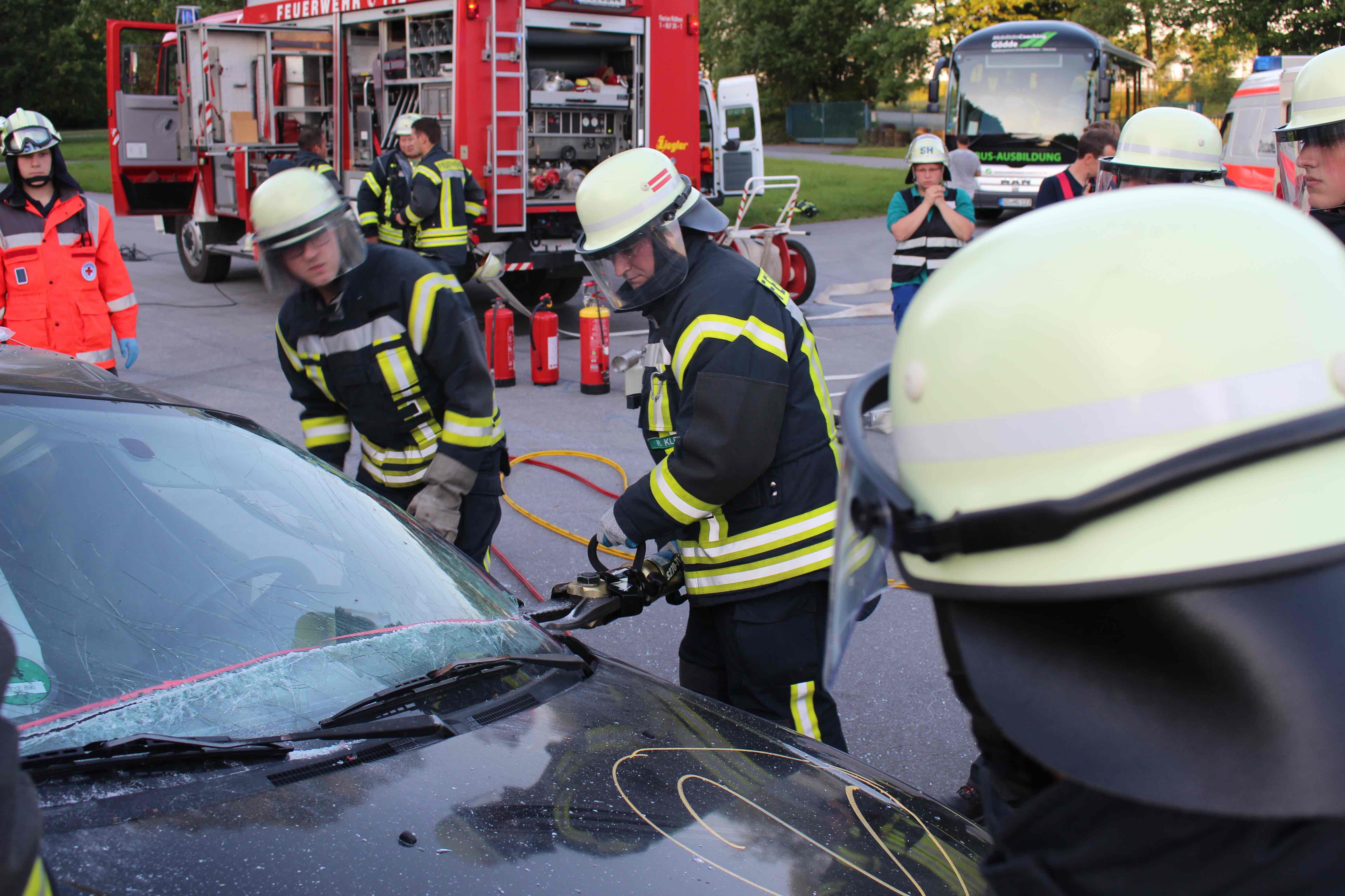 Ein Großaufgebot an Feuerwehr rückte am Mittwochabend zur Zugübung des Löschzuges 1 aus. Ein schwerer Verkehrsunfall mit 3 eingeklemmten Personen und einem brennenden PKW wurde den Kameraden gemeldet. Schon auf Anfahrt war eine dunkle Rauchwolke zu erkennen. Bei Eintreffen der ersten Einsatzkräfte stellte sich heraus, dass zwei PKW zusammengestoßen sind. Im ersten PKW befand sich eine eingeklemmte Person, dieser PKW hatte bereits Feuer gefangen. Im zweiten PKW waren zwei Personen eingeklemmt. Eine weitere Person befand sich außerhalb der Fahrzeuge und hatte durch den Schock einen Kreislaufzusammenbruch erlitten.