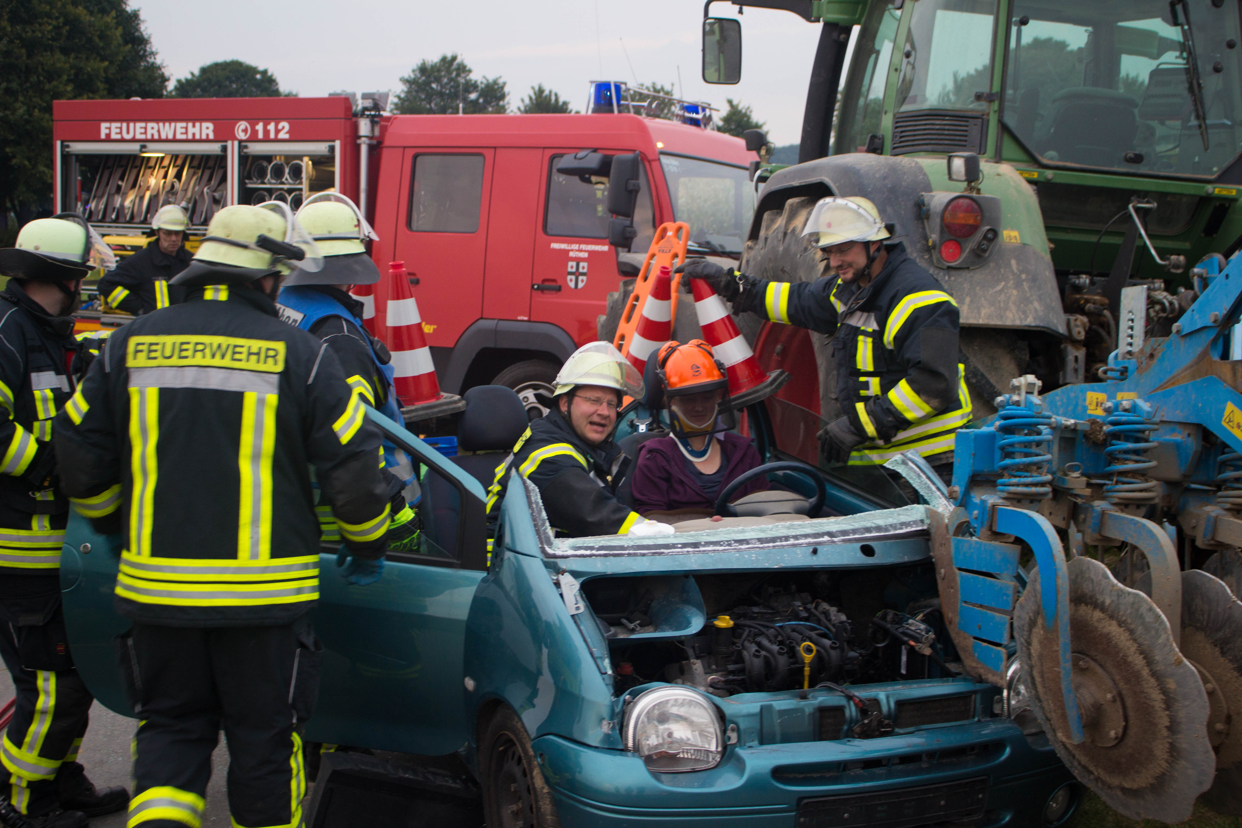 Der dicht aufsteigende Rauch ist schon kilometerweit zu sehen. Ursache ist ein brennendes Stoppelfeld am Ortsausgang Kneblinghausens. Die zur Hilfe gerufene Feuerwehr kümmert sich jedoch nicht sofort um den Flächenbrand. Priorität hat eine junge Frau, die mit ihrem Pkw, unaufmerksam durch das Feuer, gegen eine Landmaschine gefahren ist, in ihrem Fahrzeug eingeklemmt wurde. Trotzdem ist die junge Frau guter Dinge, schließlich handelt es sich nur um eine Übung des Löschzuges 3 der Freiwilligen Feuerwehr.