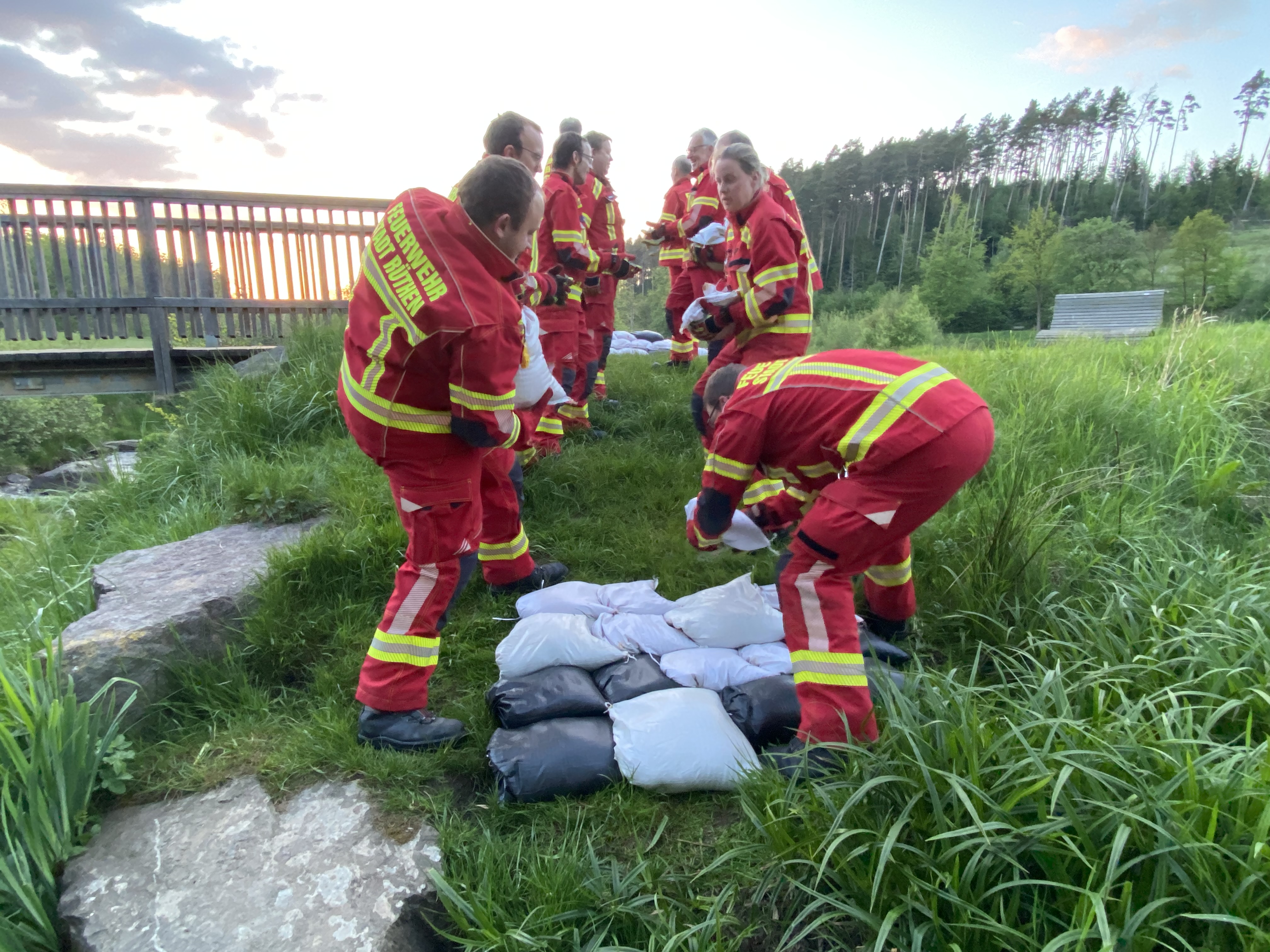 Die rund 15 Kameradinnen und Kameraden setzten ihr Wissen, welches Sie in den Wintermonaten in der Theorie erlernt haben, im Biebertal in die Tat um. Knapp eine Tonne Sand, abgefüllt in Säcken, wurden per Menschenkette befördert und an dem gewählten Punkt verbaut. Um eine gewisse Stabilität zu erreichen, gibt es gewisse Techniken, die in diesem Fall mal in der Praxis verbaut worden sind. Dank an dieser Stelle an die Feuerwehr Warstein, die uns mit den Sandsäcken ausgeholfen haben. Die Einsatzkräfte konnten an diesem Abend eine Menge mitnehmen und der Spaß war definitiv groß.