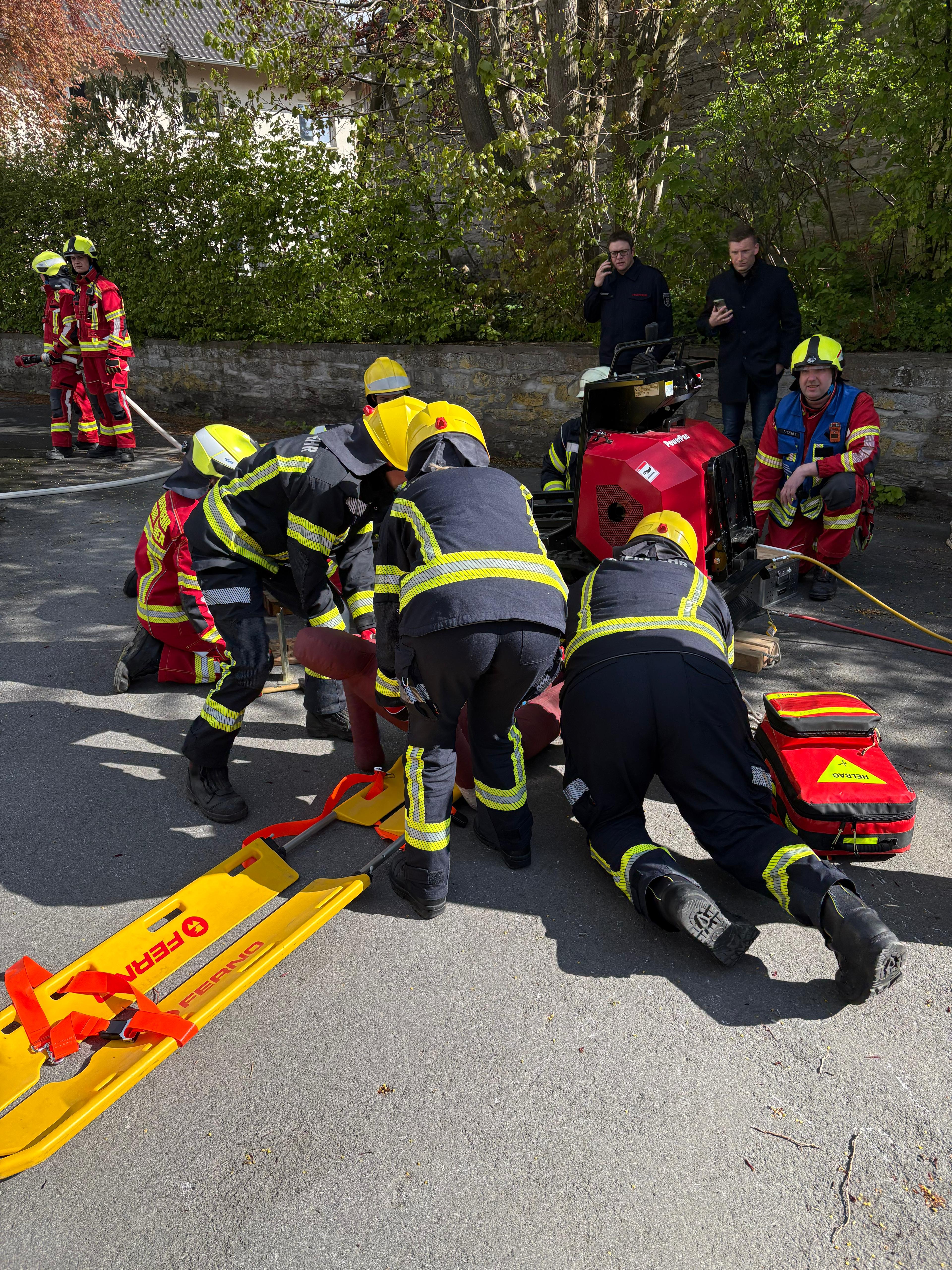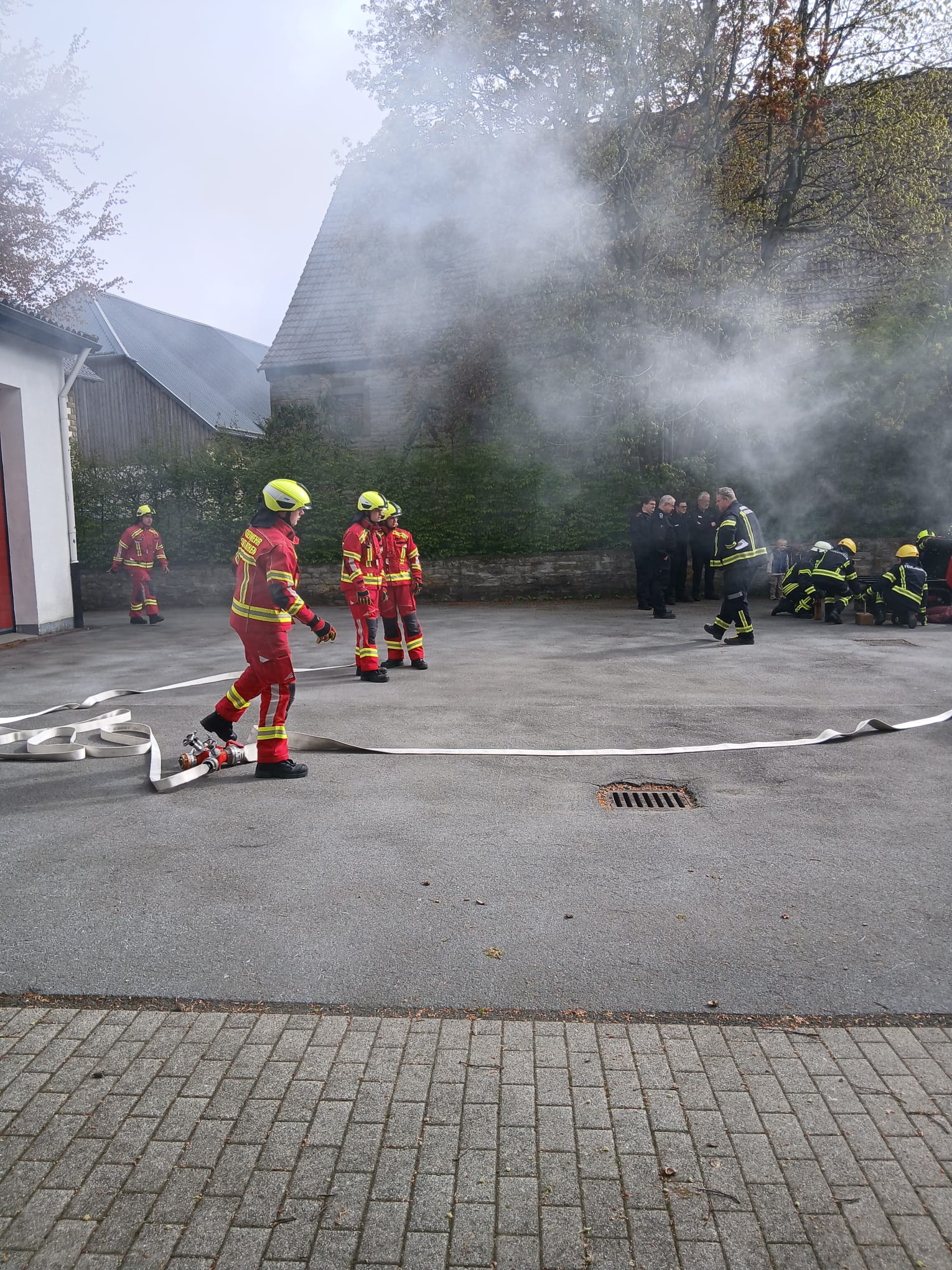 Den krönenden Abschluss bildete die gemeinsame Prüfung, bei der die angehenden Feuerwehrkameraden und Feuerwehrkameradinnen ihr Können unter Beweis stellten. So galt es, mehrere Einsatzlagen parallel zu bewältigen: Ein simulierter Dachstuhlbrand erforderte ein koordiniertes Vorgehen im Löschangriff, während gleichzeitig eine eingeklemmte Person unter einem Minidumper gerettet werden musste. Zudem wurde eine stabile Wasserversorgung aus einem künstlichen offenen Gewässer aufgebaut. Nur durch gute Kommunikation, Teamarbeit und strukturiertes Vorgehen konnten alle Aufgaben erfolgreich abgearbeitet werden. Der praktischen Prüfung war bereits unter der Woche eine theoretische Prüfung vorausgegangen, die ebenfalls von allen Teilnehmerinnen und Teilnehmern erfolgreich abgeschlossen worden war, sodass am Ende der Abschlussübung die frisch ausgebildeten Einsatzkräfte ihre Urkunde durch die jeweiligen Wehrführungen ausgehändigt bekommen haben.