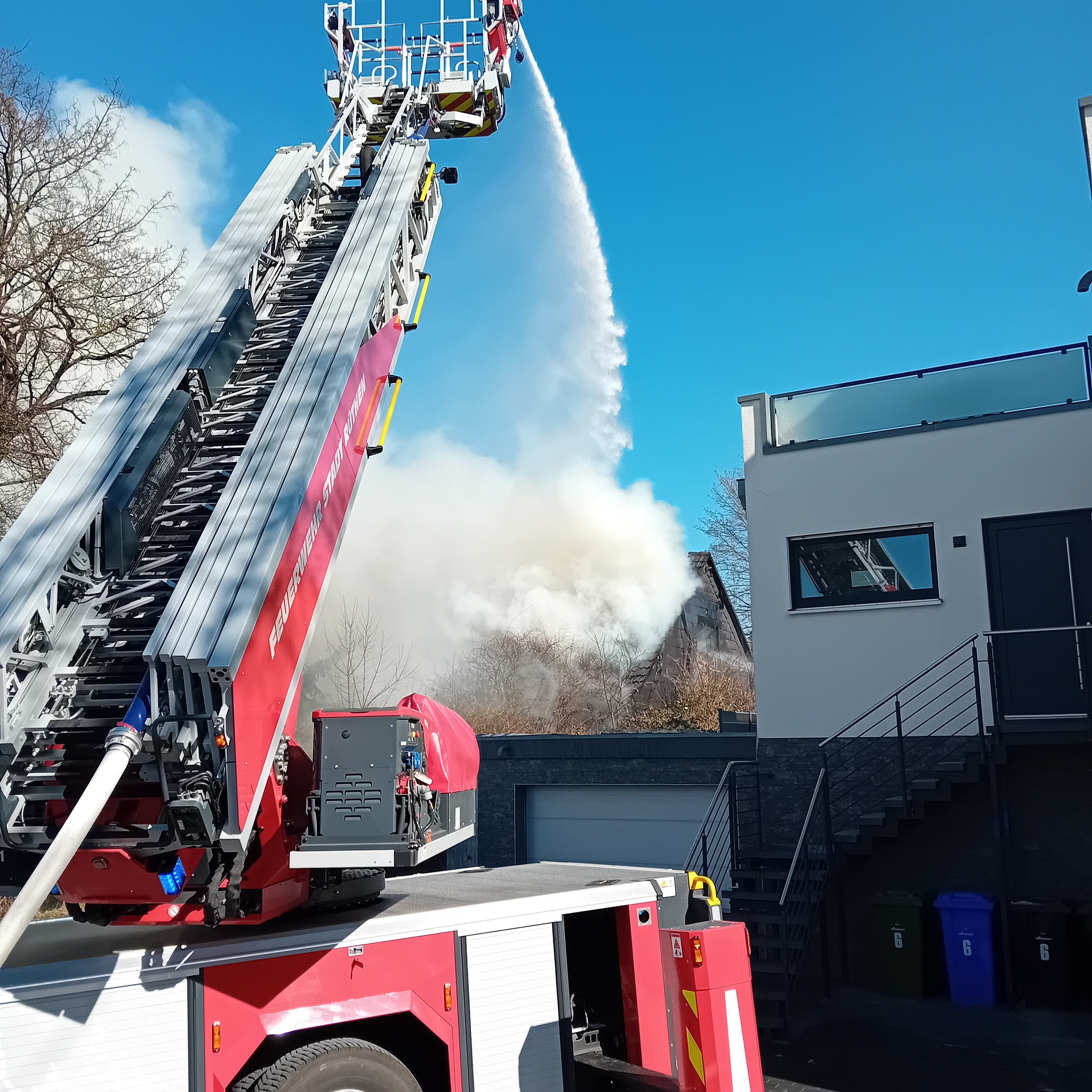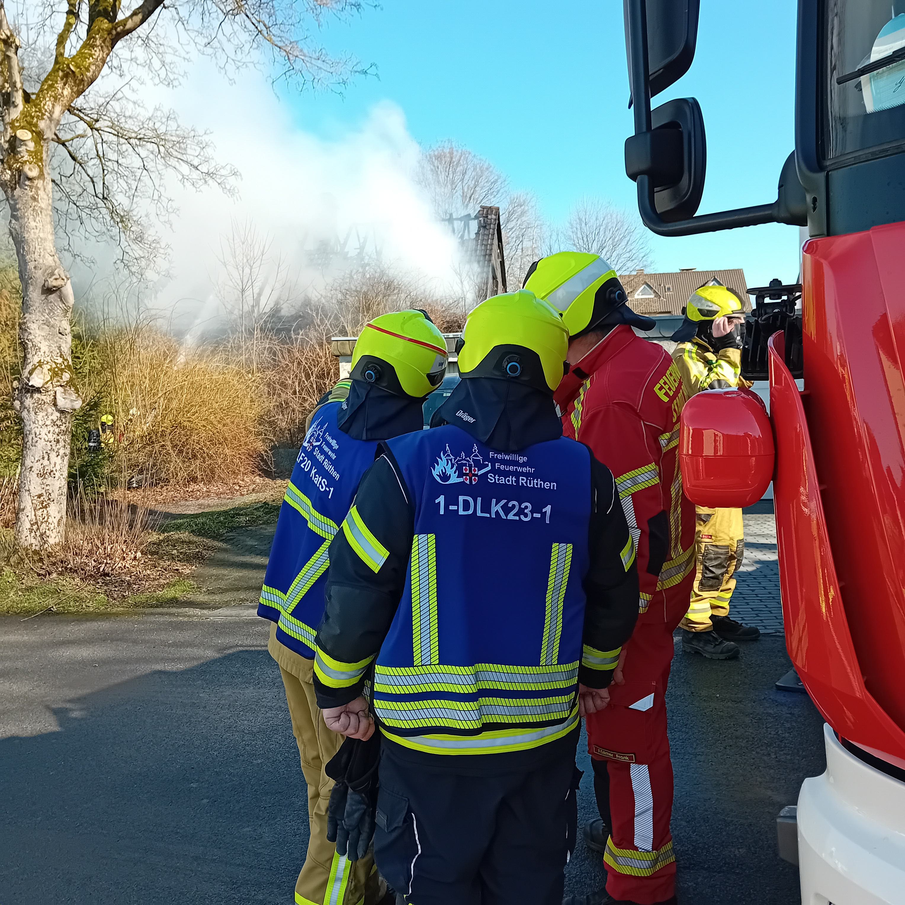 Um 11.41Uhr wurden die Löschgruppen Kallenhardt, Rüthen und Meiste/Kneblinghausen zu einem Zimmerbrand zur Straße Im Hohlpoth nach Kallenhardt alarmiert. Bereits 4min später nach der ersten Alarmierung wurde das Einsatzstichwort von Feuer 3 auf Feuer 4 Dachstuhlbrand erhöht. Nach Eintreffen der ersten Einsatzkräfte der Löschgruppe Kallenhardt wurden die beiden Bewohner des Hauses durch die Kameraden versorgt und an den Rettungsdienst übergeben. Gleichzeitig wurde die Brandbekämpfung mit mehreren Strahlrohren als Außenangriff vorbereitet. Die Drehleiter wurde vor dem Brandobjekt in Stellung gebracht, um eine gezielte Brandbekämpfung über das Wenderohr durchführen zu können. Aus dem Haus waren zu diesem Zeitpunkt bereits mehrere Hunde gerettet worden. Diese wurden im weiteren Einsatzverlauf durch das Ordnungamt Rüthen in verschiedene Tierarztpraxen zur Behandlung gebracht. Um genügend Löschwasser an der Einsatzstelle zur Verfügung haben zu können, wurde eine Wasserversorgung aus Hydranten der anliegenden Straßen aufgebaut. Die Brandbekämpfung am Gebäude war aufgrund einer enormen Rauchentwicklung nur mit Atemschutz möglich. Zu dieser Zeit wurde von Einsatzleiter veranlasst über die Leitstelle Kreis Soest eine NINA-Warnung für den betroffenen Bereich herauszugeben. Um sich Bilder von der Einsatzstelle aus der Höhe zu verschaffen wurde die Drohnengruppe der Löschgruppe Drewer zu Einsatzstelle alarmiert. Von dem Rettungszentrum in Soest wurde zeitnah der Wechsellader mit dem Abrollbehälter Atemschutz zur Einsatzstelle alarmiert. So konnten die gebrauchten Atemschutzgeräte an der Einsatzstelle wieder gewechselt werden. Durch den Einsatz mehrerer Strahlrohre und das Wenderohr der Drehleiter konnte das Feuer gelöscht werden. Das Gebäude konnte nicht mehr von den Einsatzkräfte betreten werden, da durch die Giebel und den Dachstuhl Einsturzgefahr bestand. Um an die verbleibenden Glutnester zu gelangen wurde eine Fachfirma beauftragt. Diese nahm mit einem Spezialbagger die Dachbalken und Giebel heraus von dem Gebäude. So konnten die Einsatzkräfte durch die geschaffenen Öffnungen an die Glutnester gelangen und die ablöschen. Mit mehreren Wärmebildkameras wurde die Einsatzstelle von außen abgesucht, da das Brandobjekt trotz der voraus gegangenen Maßnahmen nicht betreten werden konnte. Da sich dieser Einsatz aus der Mittagszeit bis in den Abend hinein streckte wurde das DRK Rüthen alarmiert um die im Einsatz befindlichen Einsatzkräfte an der Einsatzstelle zu verpflegen. Den Grundschutz für das Stadtgebiet stellte die Löschgruppe Oestereiden am Feuerwehrhaus Rüthen sicher. |