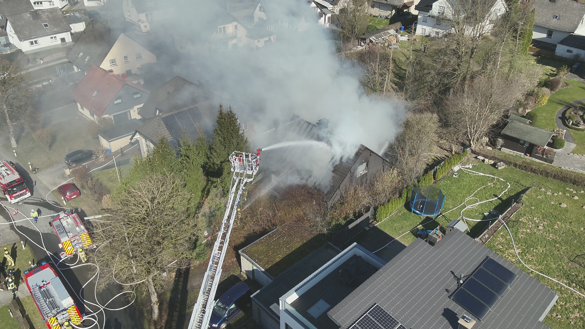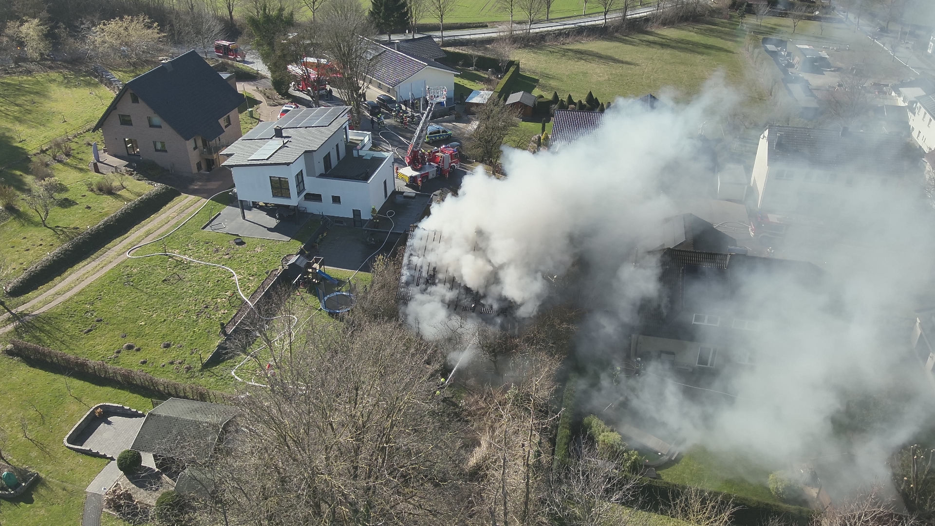 Um 11.41Uhr wurden die Löschgruppen Kallenhardt, Rüthen und Meiste/Kneblinghausen zu einem Zimmerbrand zur Straße Im Hohlpoth nach Kallenhardt alarmiert. Bereits 4min später nach der ersten Alarmierung wurde das Einsatzstichwort von Feuer 3 auf Feuer 4 Dachstuhlbrand erhöht. Nach Eintreffen der ersten Einsatzkräfte der Löschgruppe Kallenhardt wurden die beiden Bewohner des Hauses durch die Kameraden versorgt und an den Rettungsdienst übergeben. Gleichzeitig wurde die Brandbekämpfung mit mehreren Strahlrohren als Außenangriff vorbereitet. Die Drehleiter wurde vor dem Brandobjekt in Stellung gebracht, um eine gezielte Brandbekämpfung über das Wenderohr durchführen zu können. Aus dem Haus waren zu diesem Zeitpunkt bereits mehrere Hunde gerettet worden. Diese wurden im weiteren Einsatzverlauf durch das Ordnungamt Rüthen in verschiedene Tierarztpraxen zur Behandlung gebracht. Um genügend Löschwasser an der Einsatzstelle zur Verfügung haben zu können, wurde eine Wasserversorgung aus Hydranten der anliegenden Straßen aufgebaut. Die Brandbekämpfung am Gebäude war aufgrund einer enormen Rauchentwicklung nur mit Atemschutz möglich. Zu dieser Zeit wurde von Einsatzleiter veranlasst über die Leitstelle Kreis Soest eine NINA-Warnung für den betroffenen Bereich herauszugeben. Um sich Bilder von der Einsatzstelle aus der Höhe zu verschaffen wurde die Drohnengruppe der Löschgruppe Drewer zu Einsatzstelle alarmiert. Von dem Rettungszentrum in Soest wurde zeitnah der Wechsellader mit dem Abrollbehälter Atemschutz zur Einsatzstelle alarmiert. So konnten die gebrauchten Atemschutzgeräte an der Einsatzstelle wieder gewechselt werden. Durch den Einsatz mehrerer Strahlrohre und das Wenderohr der Drehleiter konnte das Feuer gelöscht werden. Das Gebäude konnte nicht mehr von den Einsatzkräfte betreten werden, da durch die Giebel und den Dachstuhl Einsturzgefahr bestand. Um an die verbleibenden Glutnester zu gelangen wurde eine Fachfirma beauftragt. Diese nahm mit einem Spezialbagger die Dachbalken und Giebel heraus von dem Gebäude. So konnten die Einsatzkräfte durch die geschaffenen Öffnungen an die Glutnester gelangen und die ablöschen. Mit mehreren Wärmebildkameras wurde die Einsatzstelle von außen abgesucht, da das Brandobjekt trotz der voraus gegangenen Maßnahmen nicht betreten werden konnte. Da sich dieser Einsatz aus der Mittagszeit bis in den Abend hinein streckte wurde das DRK Rüthen alarmiert um die im Einsatz befindlichen Einsatzkräfte an der Einsatzstelle zu verpflegen. Den Grundschutz für das Stadtgebiet stellte die Löschgruppe Oestereiden am Feuerwehrhaus Rüthen sicher. |